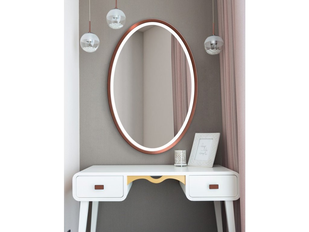 Oválné zrcadlo je umístěno v 6 cm širokém rámu, který je vyroben z vodotěsné MDF desky natřené vícesložkovým lakem. LED podsvícení činí zrcadlo ještě více unikátním protože dodá interiéru jedinečnou atmosféru.
