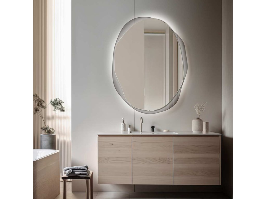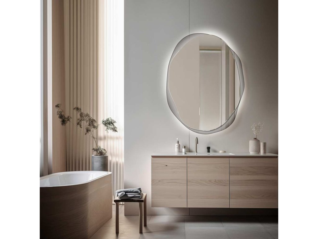 - Nepravidelný rám zrcadla Osmo je vyroben z kouřového grafitového skla. Jeho okraje jsou broušené a leštěné. Toto zrcadlo je vhodné do koupelny.