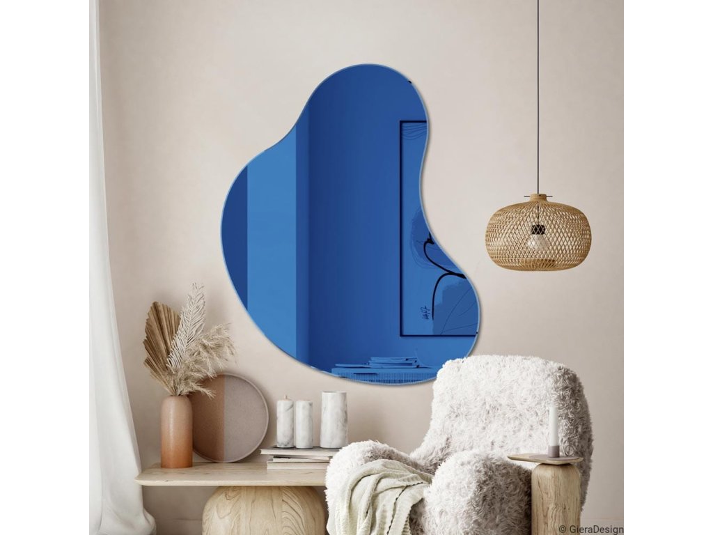 Nepravidelné nástěnné zrcadlo svým neobvyklým tvarem připomíná nebesky modrou louži. Barva nebe s nádherným odstínem přináší pocit klidu. Odráží interiér v modrém odstínu. Další výhodou tohoto zrcadla je jeho nepravidelný, organický tvar, který dokonale zapadá do současných trendů interiérového designu. Vhodné jako moderní zrcadlo do koupelny.
