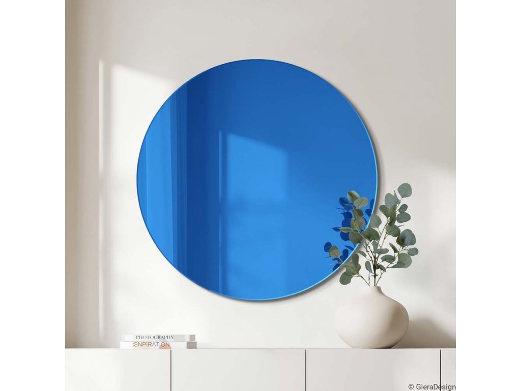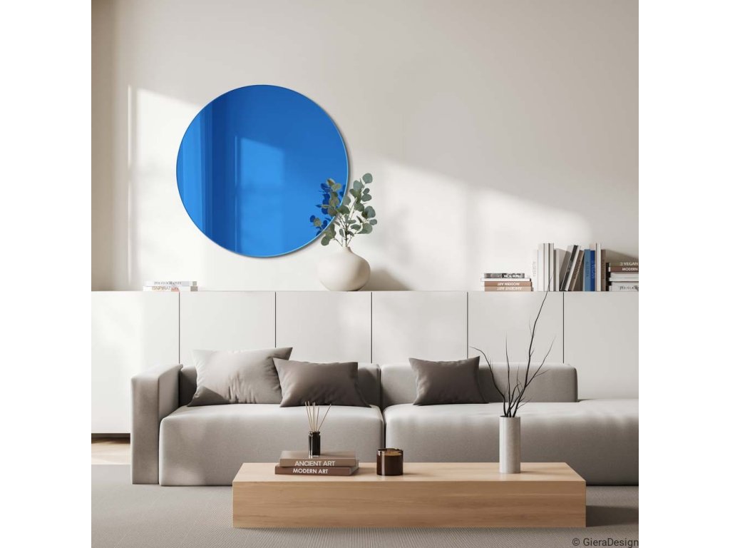 Kulaté zrcadlo v modré barvě. Barevná zrcadla jsou v současnosti hitem v interiérech, jsou skvělým doplňkem každého zařízení a stávají se originální dekorací.