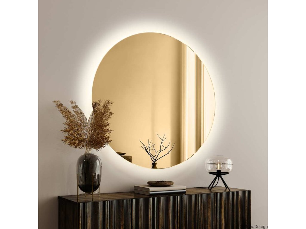 • Pokud potřebujete kulaté zrcadlo na zeď, do reprezentativních prostor nebo zrcadlo do koupelny, nemusíte hledat dál. Naše zrcadla ze série Round tohle všechno splní. V tomto případě je povrchová úprava v luxusním zlatém provedení. Velkolepost je umocněna LED podsvícením.