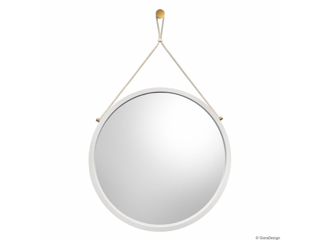 Minimalistické kulaté zrcadlo v tenkém bílém rámu se zlatými bočními úchyty a krémovým provazem. Ideální do skandinávských a moderních interiérů. Rám je vyroben z voděodolné MDF desky lakované tvrdým dvousložkovým polyuretanovým lakem. Zrcadlo s vysokým leskem. Na výběr je možné zvolit si věšák na provaz v bílé nebo zlaté barvě.