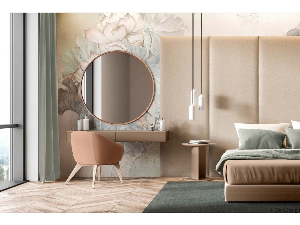 Kulaté nástěnné zrcadlo ve velmi úzkém rámu v měděné barvě. Toto nadčasové zrcadlo představuje ideál …