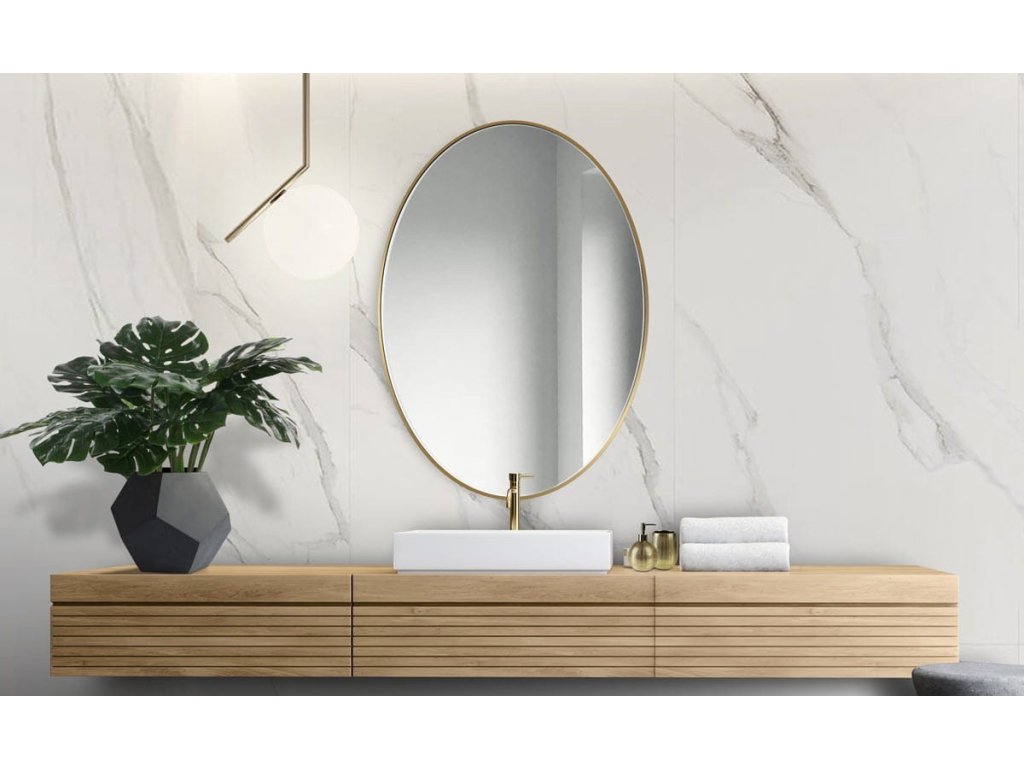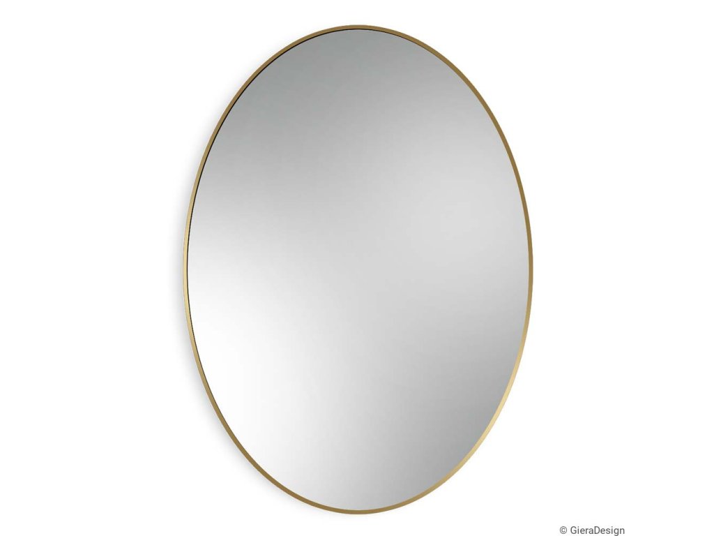 Nadčasové oválné nástěnné zrcadlo zaujme jednoduchostí a kvalitou zpracování. Vyhotovené je ve velmi úzkém zlatém rámu, ideální pro interiéry v moderním, skandinávském nebo průmyslovém stylu. Rám zrcadla je vyroben z voděodolné lakované MDF. Je chráněno před korozivním účinkem vlhkosti - vhodné i do koupelny. V zadní části zrcadla jsou namontovány úchytky na zavěšení.