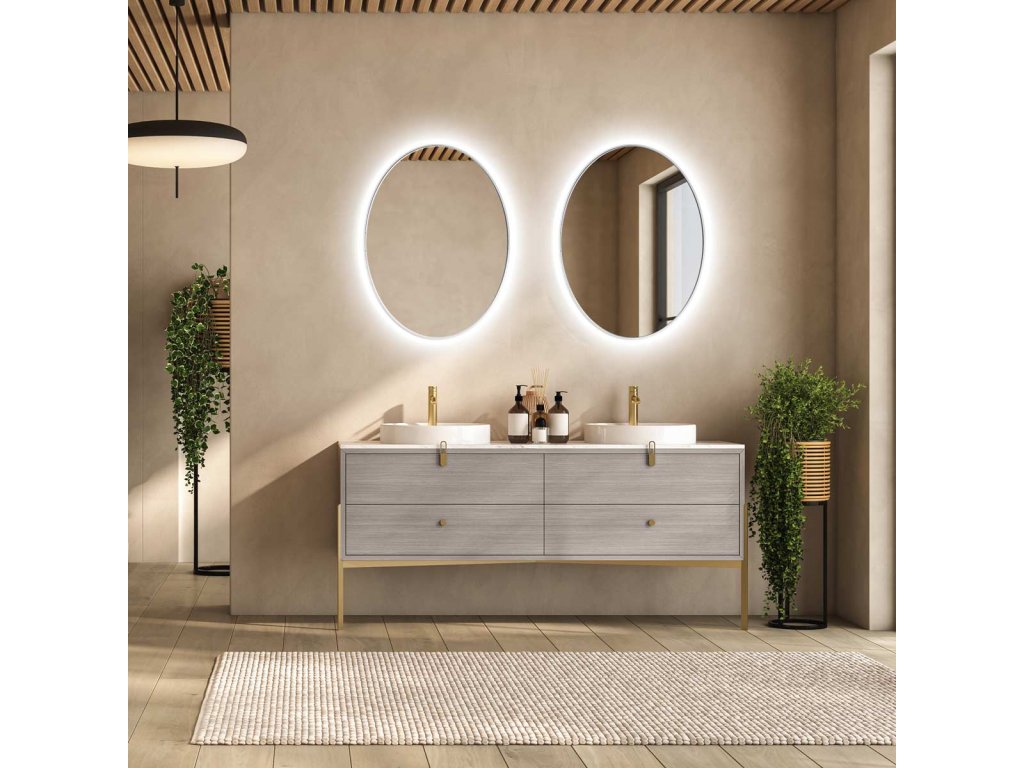 - Tenký 10 mm rám je vyroben z voděodolné MDF desky, lakované bílým tvrdým metalickým lakem určeným do interiéru. Matná povrchová úprava. Zrcadlová deska byla nalepena bez narušení lakového nátěru (žádné cvočky ani hřebíky), čímž byla zajištěna dlouholetá vodotěsnost rámu. Spodní strana zrcadla je chráněna teflonem, který jej chrání před korozivními účinky vlhkosti. Rám je vhodný do koupelny.