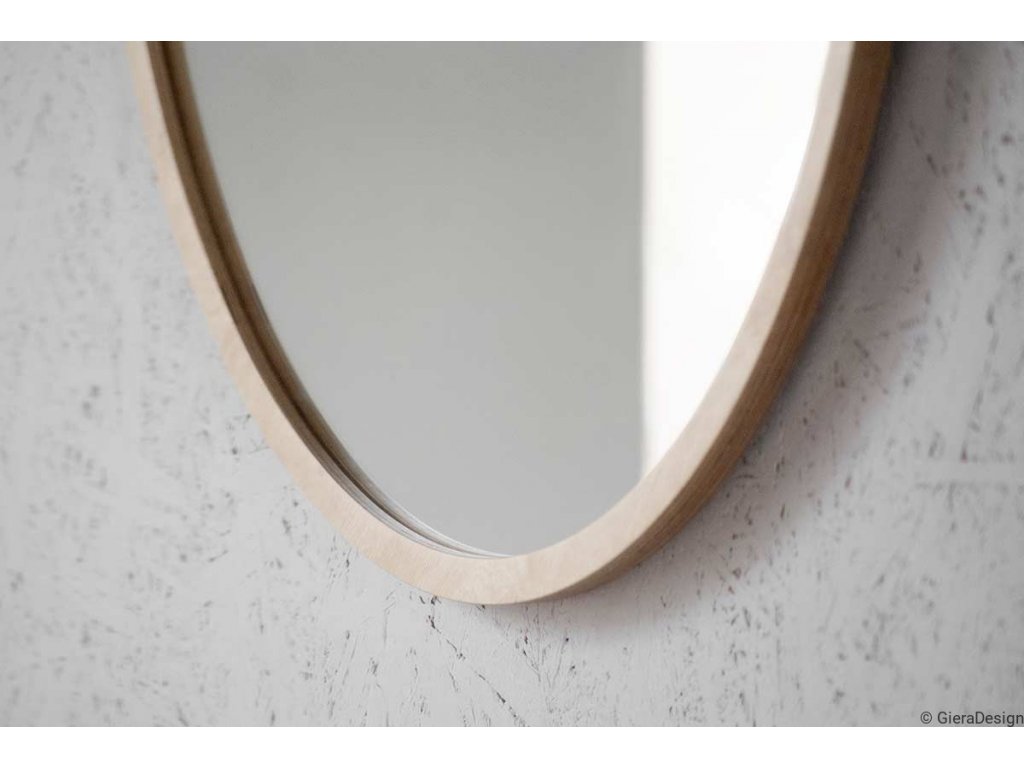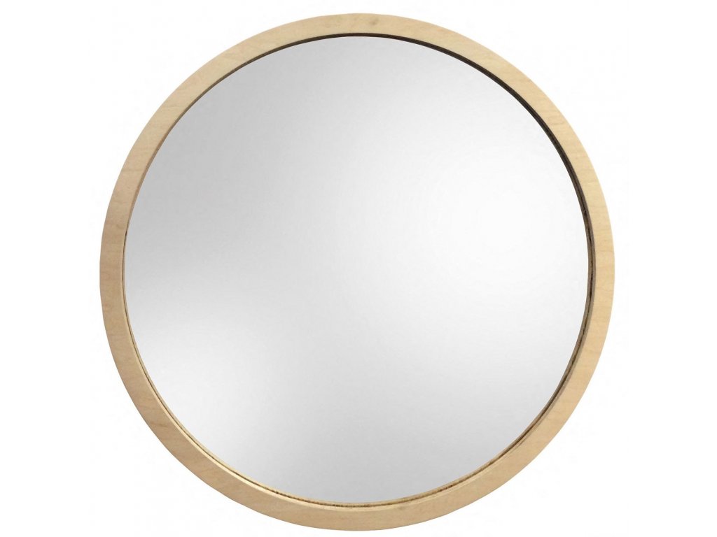 Naturální kulaté zrcadlo na zeď v tenkém rámu z překližky. Toto moderní zrcadlo představuje ideální doplněk interiéru v moderním, skandinávském nebo průmyslovém stylu. Luxusní zrcadlo do obývacího pokoje.