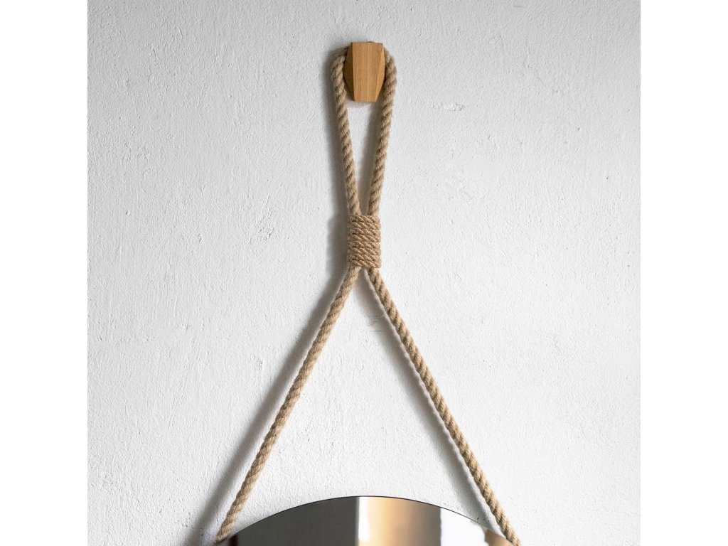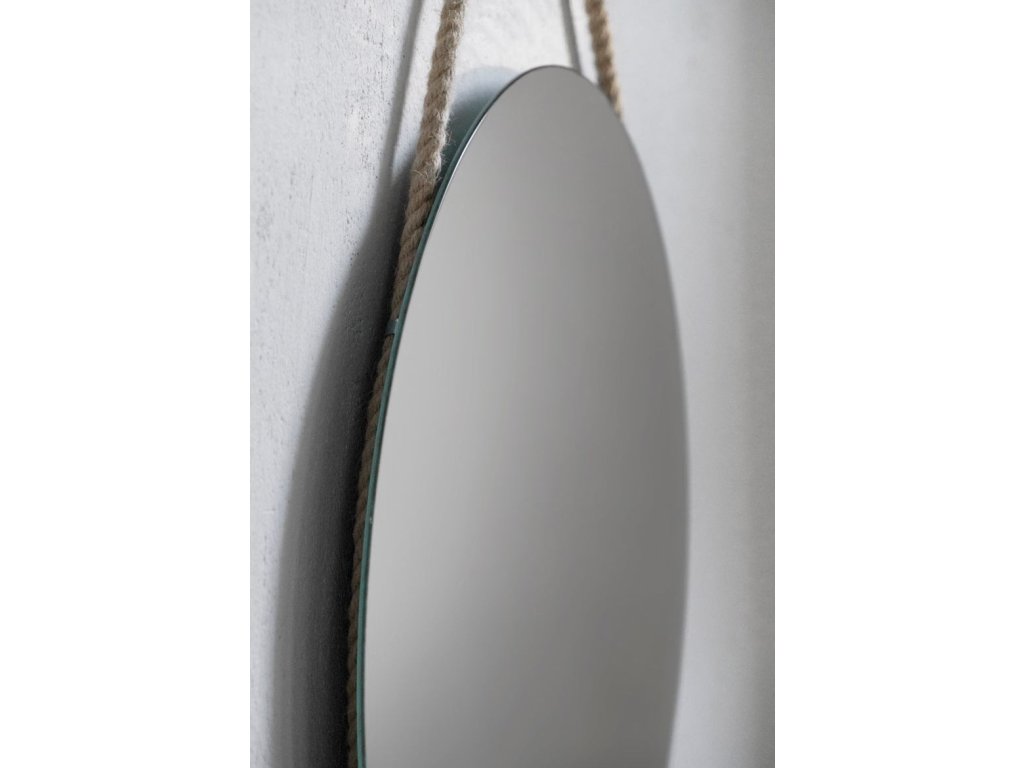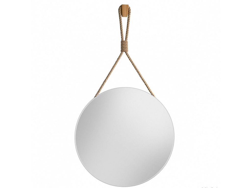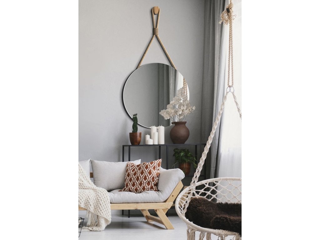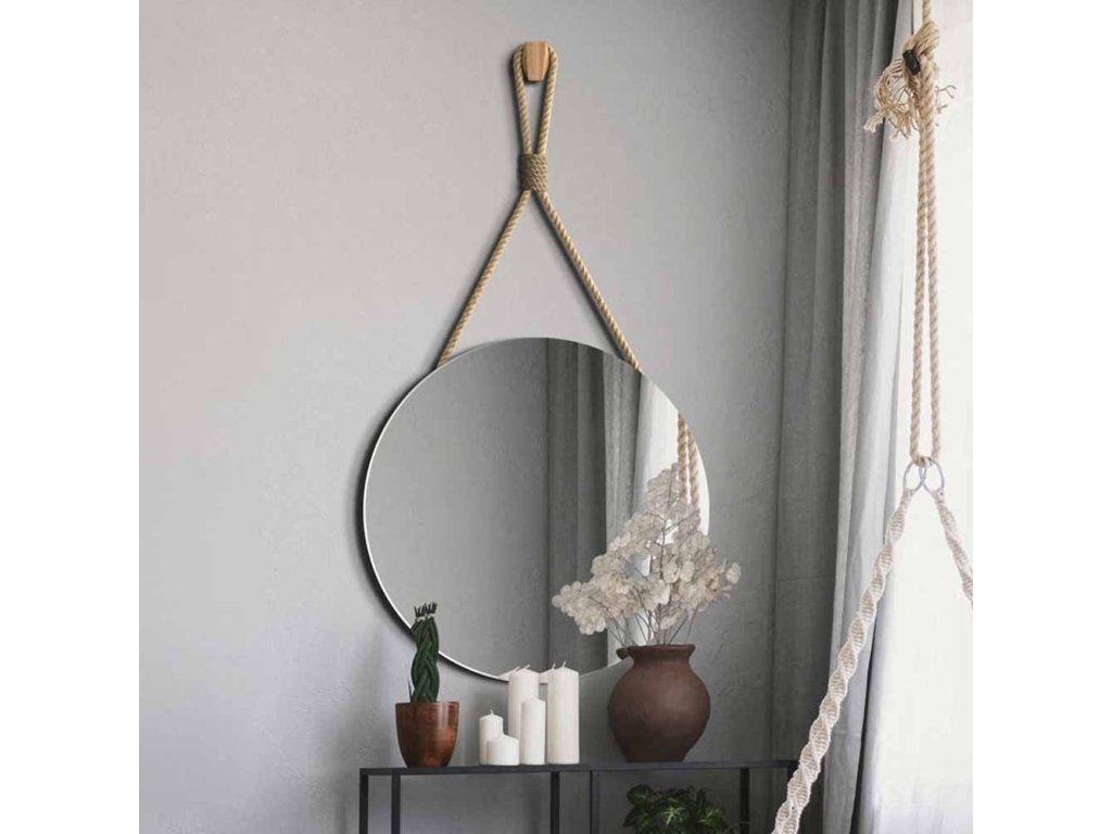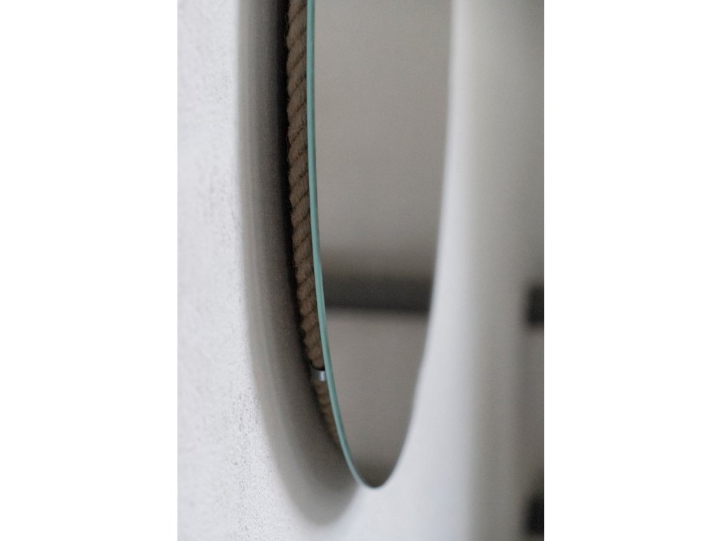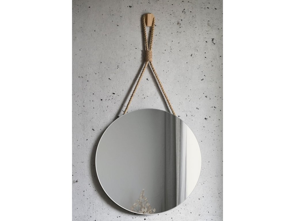 Nádherná kulatá nástěnná zrcadla zavěšená na jutovém laně s dekorativním opletením. Jednoduché, ale poutavé zrcadlo zapadá do současných trendů, kde nejvíce trendy jsou přírodní a ekologické materiály. Jutové lano má přírodní barvu, lze regulovat jeho délku. Tloušťka lana je 15 mm. Ozdobný oplet je z tenčího lana. Na zadní straně zrcadla je připevněn věšák.Zrcadlo se ideálně hodí do skandinávského, ekologického či wabi-sabi stylu. Zabezpečeno je vrstvou teflonu, která jej chrání před korozivními účinky vlhkosti - vhodné do koupelny.