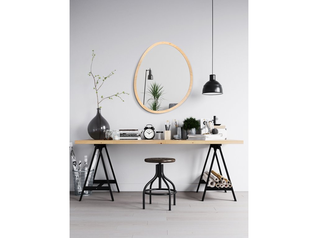 Zrcadlová tabule je umístěna v tenkém rámu, který může být vyroben z dvojitě olejované překližky z tvrdého dřeva nebo voděodolné MDF desky lakované vícesložkovým lakem. Vzadu jsou věšáky. Zrcadlo je vyrobeno na objednávku.